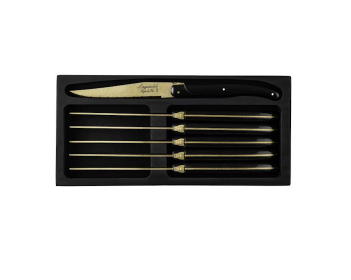 Deze 6 steakmessen in goudkleur met een stonewash afwerking zijn een sieraad op tafel. De messen zijn van RVS en de heften van zwart ABS. De set wordt geleverd in een zwart houten tray wat een mooi contrast oplevered met de goudkleurige steakmessen.